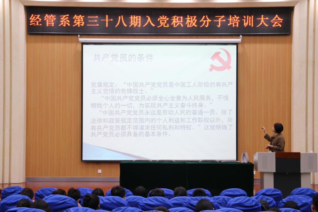 4月17日晚,经济与管理系于三号楼报告厅开展入党积极分子培训第六讲――共产党员的条件。本次培训由刘永萍老师主持讲解。