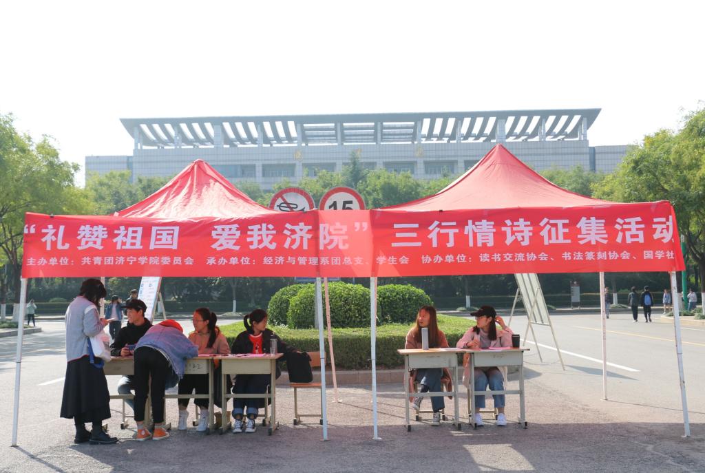10月16日至22日,由共青团济宁学院委员会主办,经济与管理系(儒商学院)团总支承办,读书交流协会、书法篆刻协会和国学社共同协办的“礼赞祖国,爱我济院”三行情诗创作活动顺利举行。