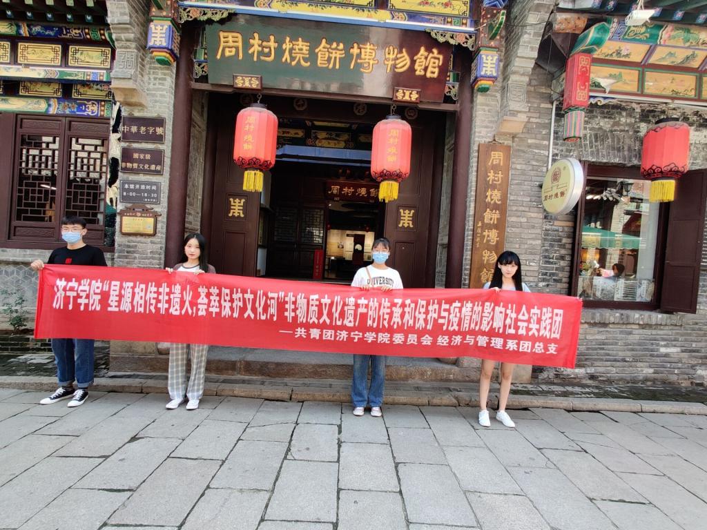 爱我山东,助力文化传承。为更深入的了解我国非物质文化遗产,树立非物质文化遗产的传承与保护观念,2020年8月18日,经济与管理系2019级证券与期货一班薛寒霜、周金伟、潘志杰,2019级证券与期货二班韩佳瑞四名同学来到了淄博市周村古商业街大街。