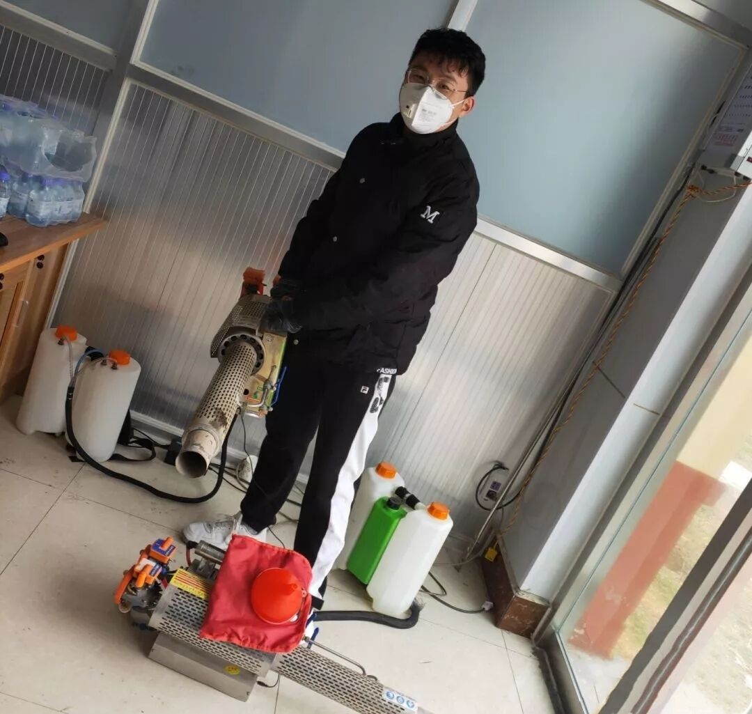 2018级经济学(金融与财务外包方向)的邹云海同学,家住山东省济宁市兖州区兴隆庄镇滨河社区王庄村,每日主动地在社区消毒打药,提水,配84消毒液,进行杀菌消毒工作。邹云海说道:我早上9点半左右开始,在社区里的村卫生室开始,接水,提水,倒84消毒液,配消毒药水,坐三轮上给社区街道消毒。