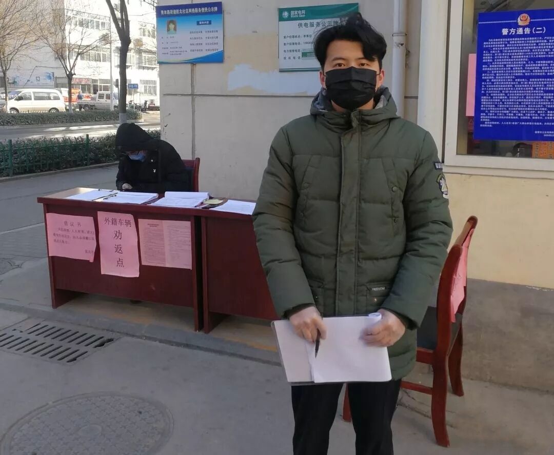 2017级思想政治教育(师范方向)的李鑫龙同学防疫期间自愿在周村区北航社区值班,献出自己的一份力。李鑫龙说:在做好防护措施的前提下,我到周村区北航社区值班,拦截外来人员与车辆,劝导人员聚集,记录进出社区的人员并随时报备,做好社区疫情防控工作。