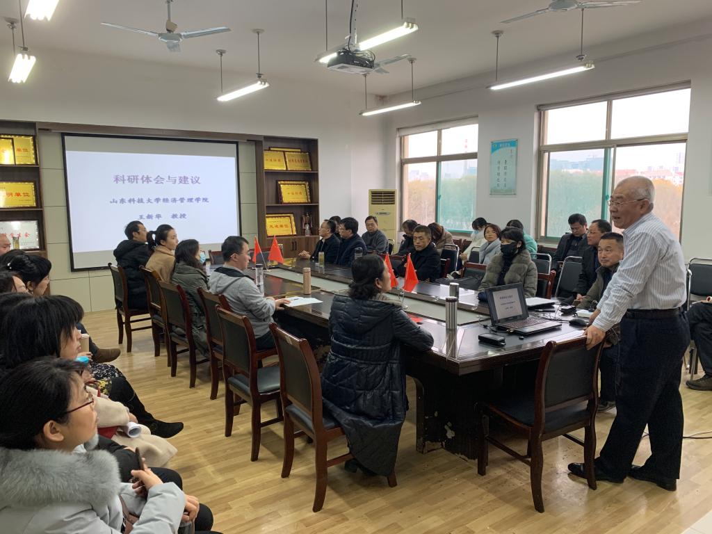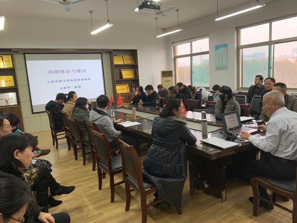 12月9号下午,山东科技大学王新华教授来我系与全体教师开展了科研建设与规划座谈会。会上,王教授以自身团队丰富和鲜活的科研项目实例进行导入,从管理学科的特点,专业知识的积累,科研素养的培育,实践经验的获得,科研团队的合作到科研项目申请书的撰写等多个方面系统的进行了讲解。针对老师们在科研中遇到的困惑和问题进行了耐心的解答,老师们受益匪浅。