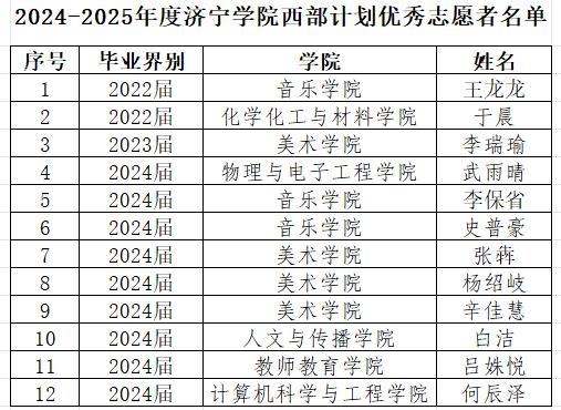 大学生志愿服务西部计划是由共青团中央、教育部、财政部、人力资源和社会保障部等部门共同组织实施的重大工作项目,旨在鼓励和引导高校毕业生深入基层、服务西部,在国家最需要的地方施展才华、贡献力量。自项目实施以来,我校连续23年选派260名优秀毕业生赴祖国西部基层开展志愿服务,他们以实际行动践行“奉献、友爱、互助、进步”的志愿精神,履行“请党放心,强国有我”的铮铮誓言,在西部广袤天地中挥洒青春、砥砺奋斗,展现了济宁学院学子的责任与担当。