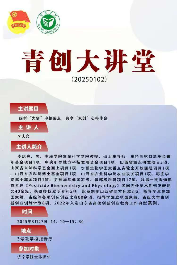 专家介绍:李庆亮,男,枣庄学院生命科学学院教授,硕士生导师。主持国家自然基金青年基金项目1项,中央引导地方科技发展资金项目1项,山西省重点研发项目3项,山西省自然科学基金面上项目1项,水稻生物学国家重点实验室开放课题项目1项,山西省农科院博士基金项目1项,山西省农业科学院农业攻关项目1项、枣庄学院博士基金项目1项。另参加其他国家级、省部级科研项目17项。以第一或者通讯作者在《Pesticide Biochemistry and Physiology》等国内外学术期刊发表论文40余篇。获得授权发明专利5项,起草制定山西省地方标准3项。指导学生参加国家级、省级等各项创新创业比赛80余项,指导学生立项国家级、省级大学生创新创业训练计划8项,2022年入选山东省高校创新创业教育工作典型案例。