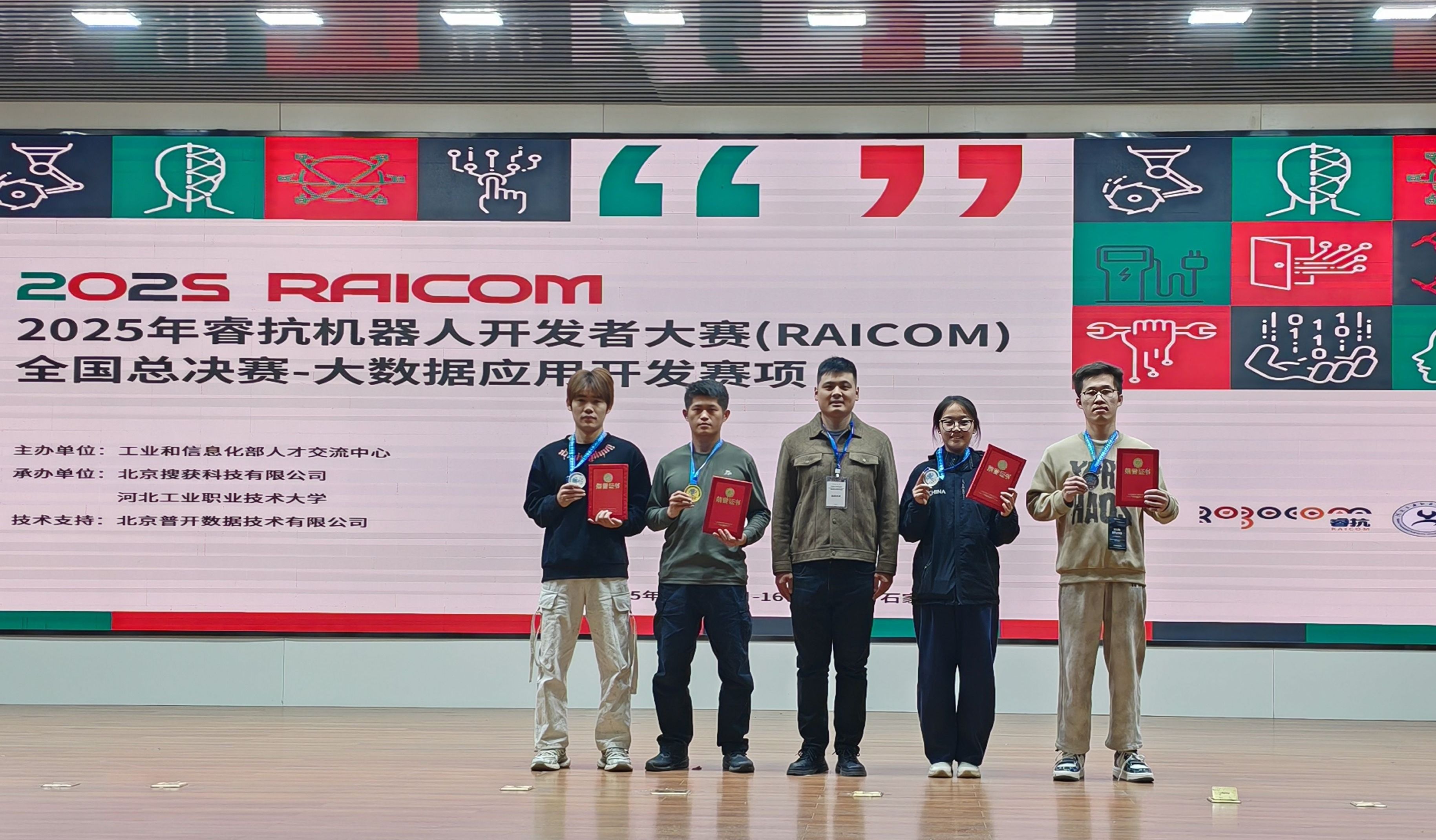 11月13日至16日,2025年睿抗机器人开发者大赛(RAICOM)全国总决赛在河北石家庄顺利举行。本次大赛信息技术创新赛道——大数据应用开发赛项,吸引了全国众多高校的优秀学子同台竞技。我校计算机科学与工程学院学子通过校赛省赛选拔,共有四名同学晋级国赛,经过激烈角逐,全部获奖,共斩获国家一等奖一项、二等奖两项、三等奖一项,展现了我院在大数据技术与应用领域的扎实基础和创新能力。