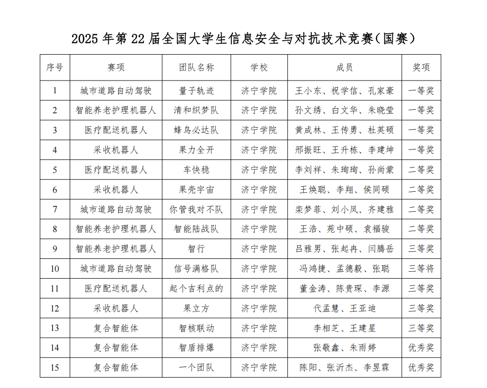 近日,第22届全国大学生信息安全与对抗技术竞赛全国总决赛成绩公布,我校机电工程学院9支参赛队、物理与电子工程学院6支参赛队,在智能安全赛城市道路自动驾驶、智能养老护理机器人、医疗配送机器人、采收机器人、复合智能体等五个赛道中荣获一等奖4项、二等奖4项、三等奖5项、优秀奖2项。