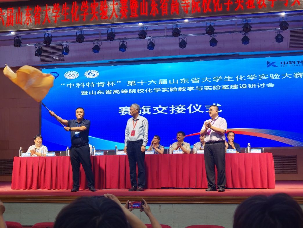 闭幕式上,作为下一届赛事的主办单位,刘涛代表学院接过赛旗,标志着第十七届山东省大学生化学实验大赛正式进入“济宁学院时间”。这一殊荣既是对学院办学实力的认可,也为进一步深化全省化学实验教学交流提供了重要平台。