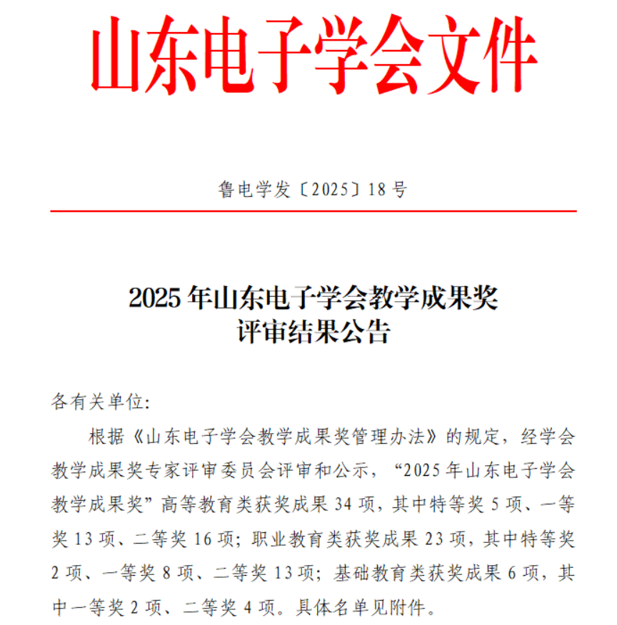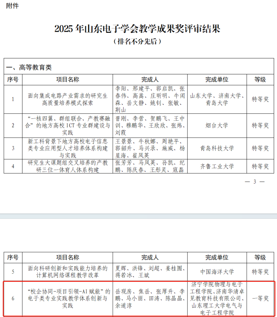 近日,2025年山东电子学会教学成果奖评审结果公告正式发布,我校物理与电子工程学院副院长岳现房教授牵头,与济南华清卓见教育科技有限公司、山东理工大学电气与电子工程学院共同申报的《“校企协同-项目引领-AI赋能”的电子类专业实践教学体系创新与实践》项目获2025年山东电子学会高等教育教学成果一等奖。