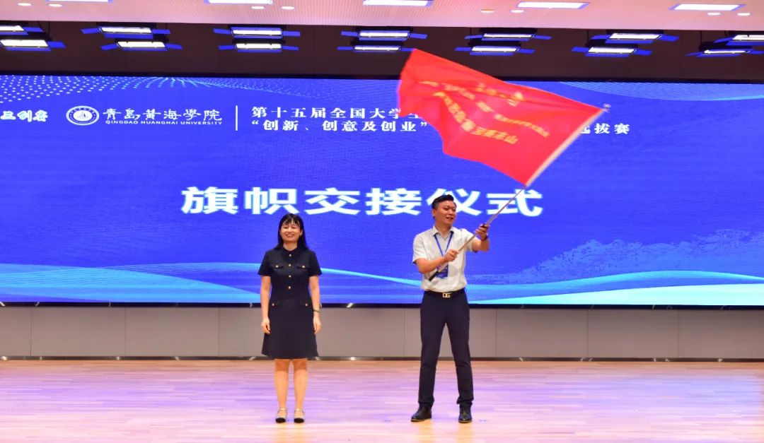 随后,举行第十五届与第十六届山东省三创赛选拔赛旗帜交接仪式。青岛黄海学院国际商学院将象征着赛事传承与延续的旗帜交给第十六届三创赛承办单位代表济宁学院经济管理学院,第十六届三创赛山东省选拔赛将由济宁学院承办。