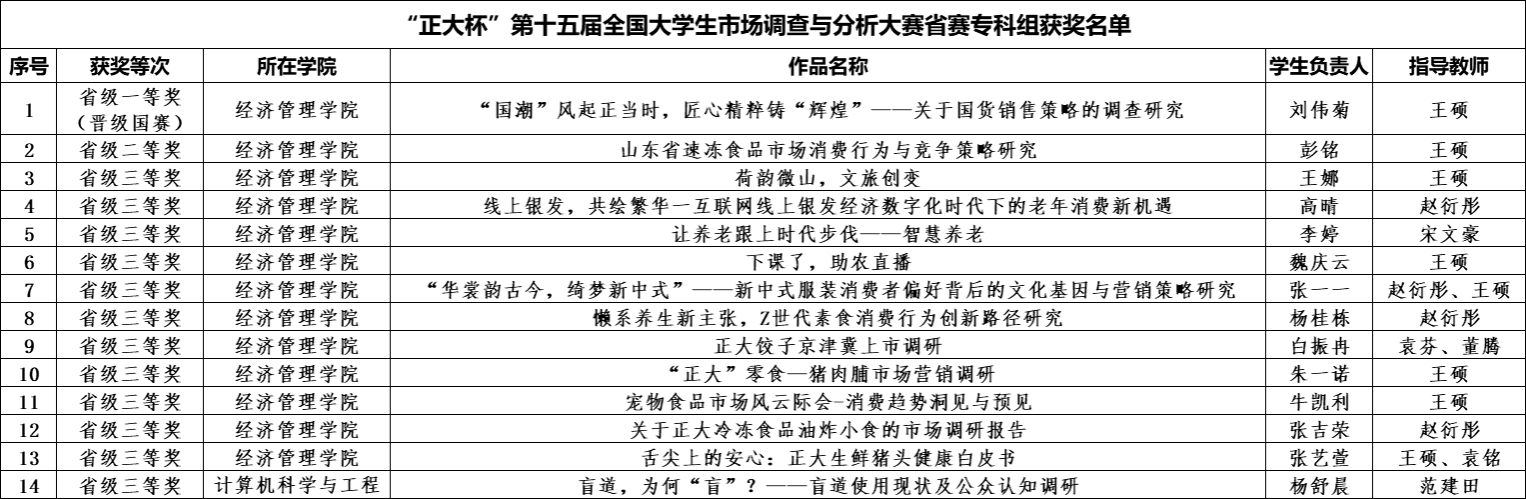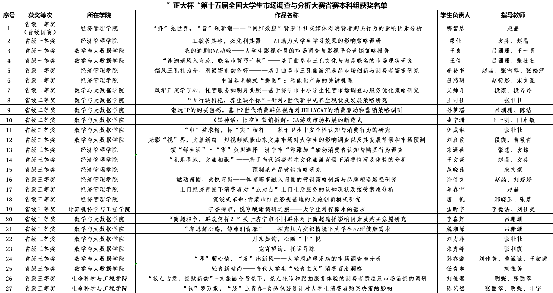 近日,由中国商学统计协会主办的“正大杯”第十五届全国大学生市场调查与分析大赛省赛结果正式公布。经过激烈角逐,我校共斩获本科组27项奖项(一等奖4项、二等奖8项、三等奖15项)及专科组14项奖项(一等奖1项、二等奖1项、三等奖12项),其中我校经济管理学院本科、专科各1支团队成功晋级全国总决赛,创下我校参赛以来最佳战绩。