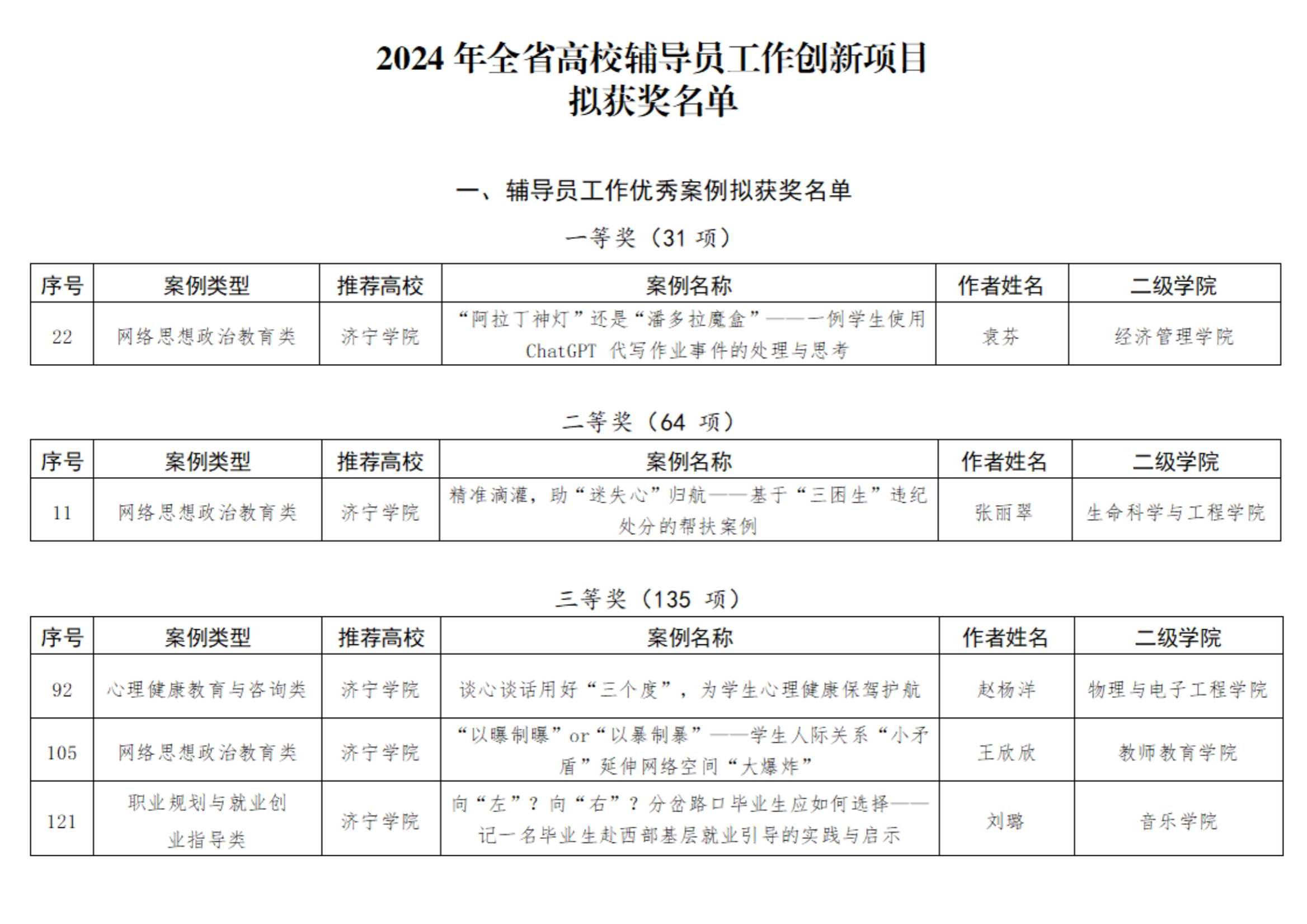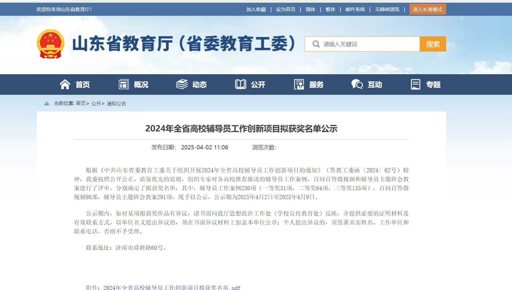 近日,由山东省委教育工委组织开展的2024年全省高校辅导员工作创新项目评选结果揭晓,我校辅导员在该项评审中斩获佳绩,荣获辅导员工作优秀案例一等奖1项,二等奖1项,三等奖3项;获评辅导员主题班会优秀教案集体作品2项,个人作品2项。获奖总数在省内同类高校中位居前列。