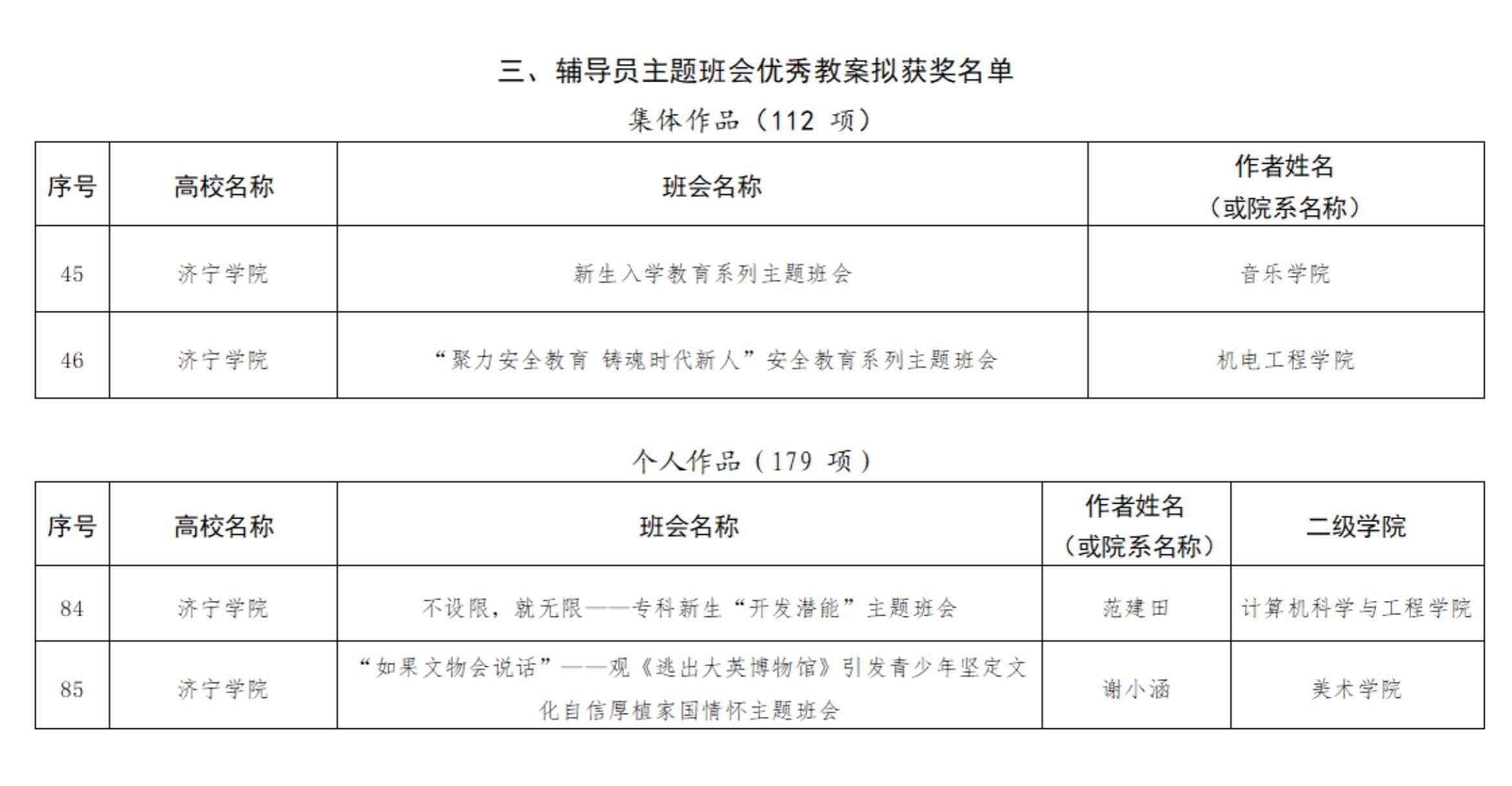 本次活动由中共山东省委教育工委组织,经各高校推荐申报、专家评审等环节,评选辅导员工作案例230项(一等奖31项,二等奖64项,三等奖135项),辅导员主题班会教案291项(集体作品112项,个人作品179项)。我校积极响应山东省委教育工委活动要求,于2024年上半年启动校内辅导员优秀案例、优秀主题班会教案评选活动。学生工作处高度重视,广泛宣传动员辅导员老师们积极撰稿参与,邀请专家评委评审指导,精心打磨优秀项目,推荐5项辅导员工作案例、8项主题班会教案参加省级评选。