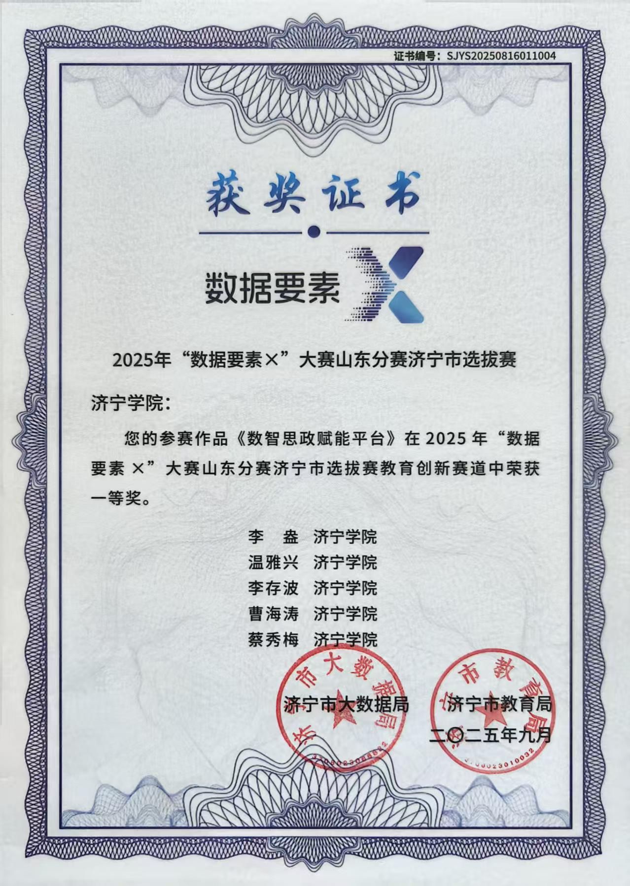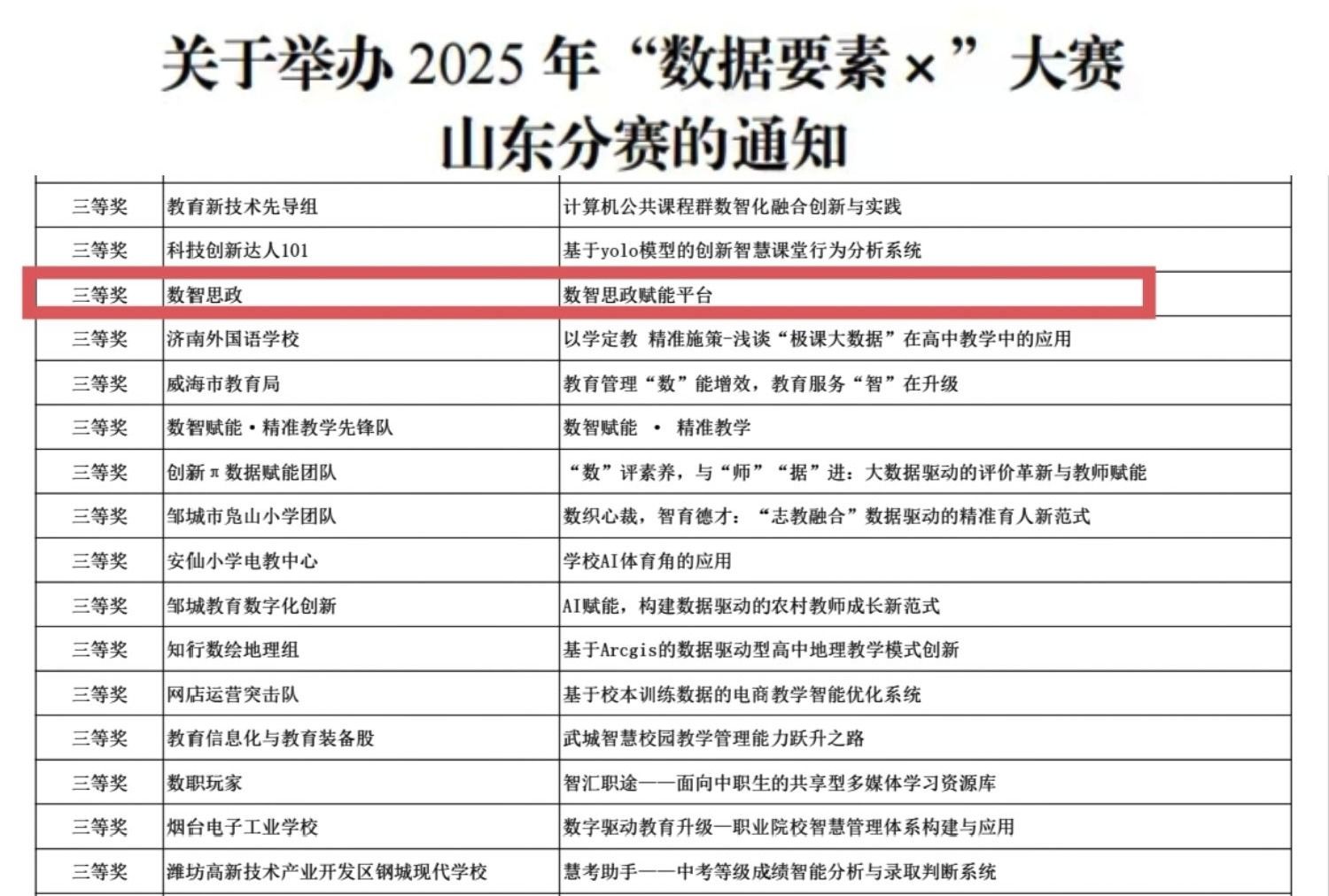 近日,2025年“数据要素×”大赛山东分赛决赛在济南落下帷幕。马克思主义学院李盎老师领衔的教师团队凭借《数智思政赋能平台》项目,在教育创新赛道中荣获三等奖。